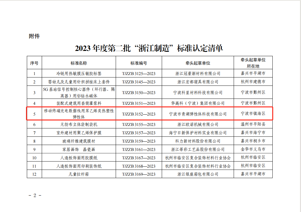 寧波市青湖彈性體科技有限公司牽頭起草的《移動終端充電數(shù)據(jù)線用苯乙烯類熱塑性彈性體》T/ZZB 3152—2023浙江制造團體標準名列其中。