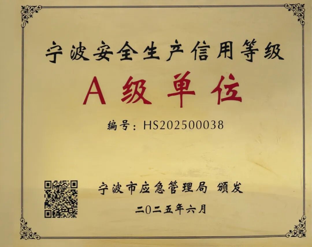 成功斬獲“寧波市安全生產信用等級A級”榮譽,這是寧波市對市場主體安全生產綜合能力的最高級別認可。