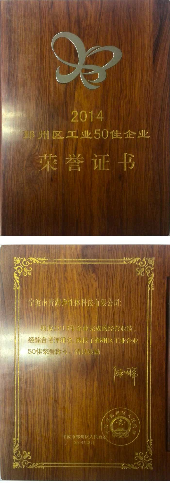 2014年6月18日,寧波市青湖彈性體科技有限公司獲得鄞州區(qū)人民政府頒發(fā)授予的“2014鄞州區(qū)工業(yè)50佳企業(yè)”榮譽(yù)證書(shū)。
